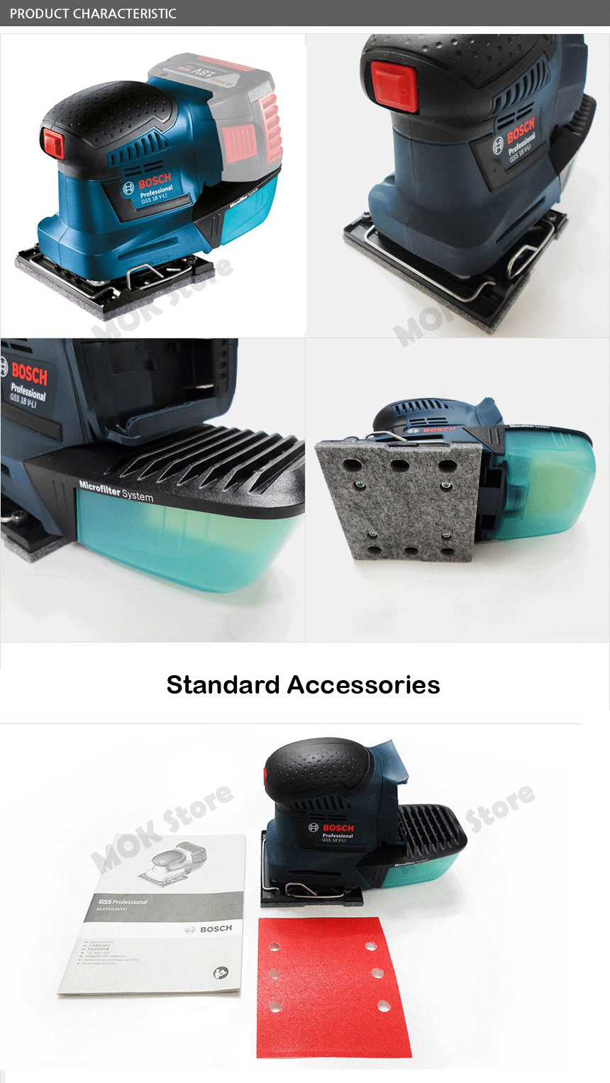 - Dust box (Bosch Micro filter dust extraction system) for easy dust collection