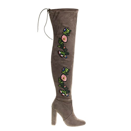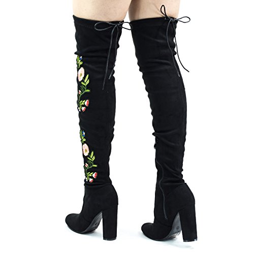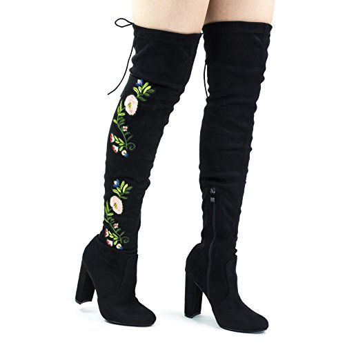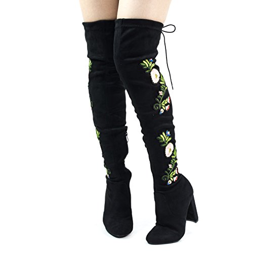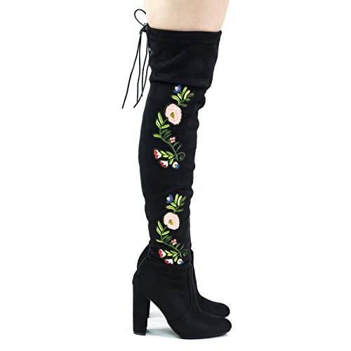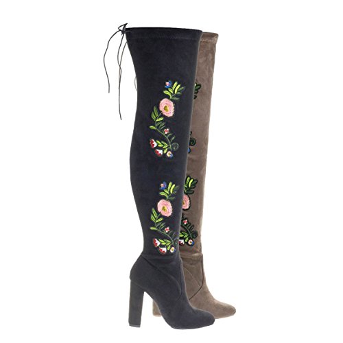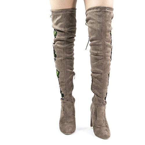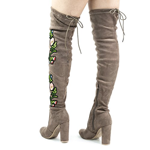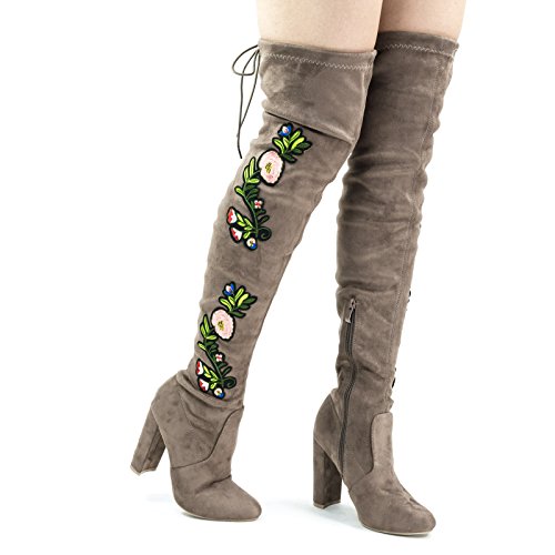 Binding : Apparel Product Description About This Shoes :Delight your legs in these gorgeous over the knee thigh high boots featuring high block heel, almond toe, heat pressed multi colored embroideredy patch and rear tie closure that ties on the back. Please measure your thigh circumference carefully beofre making the purchase as it will not fit everyone. Brand - Top Moda Colors Available: Black, Taupe Gray Occasion: Clubwear Shoe Type: Shoe Style: Inner Lining: synthetic Heel Height In Inches - 4 Heel Style - Block Toe Style - round-toe Platform Height In Inches - 0.25 Shaft Height In Inches - 22.5 Circumference Opening - 17 Strap Type - strapless Sole - manmade All Man Made Material unless otherwise stated. Computer/Phone/Table monitors might show color differently because of its quality or calibration, we suggest you look at the photo in at least 3 monitors if you need exact color match of your shoes. 0