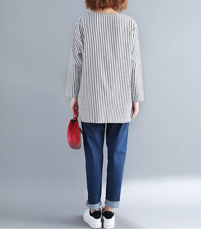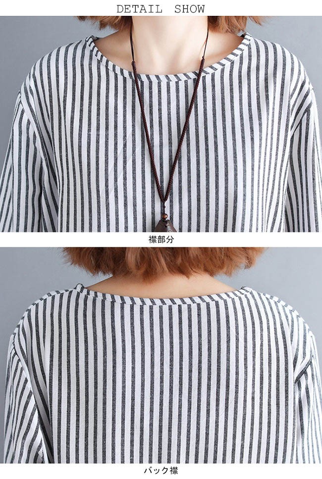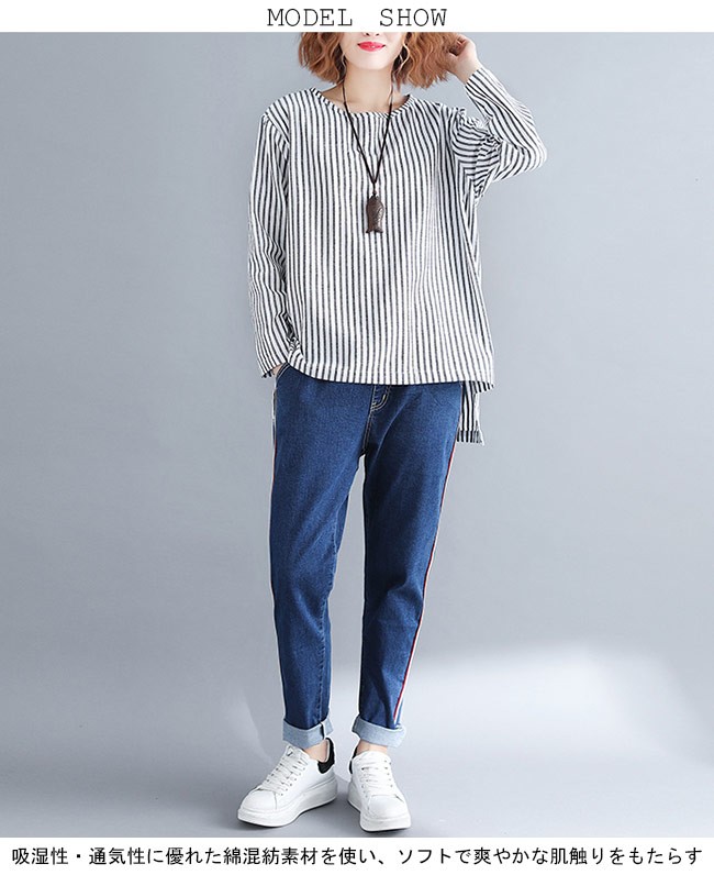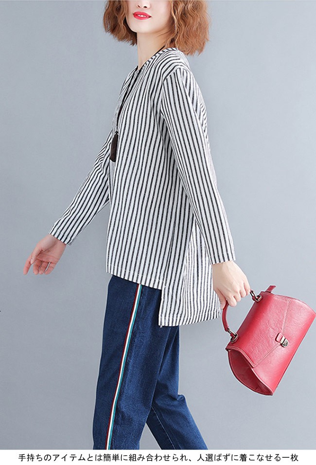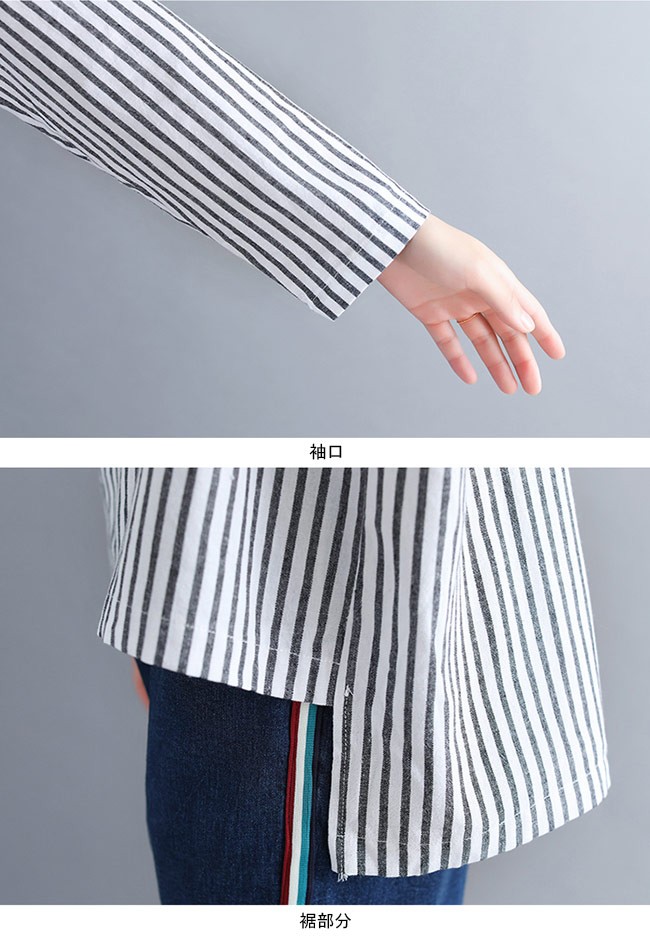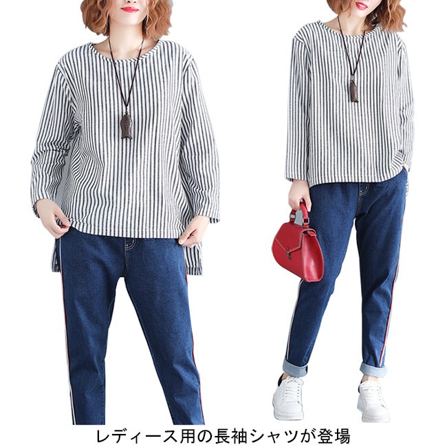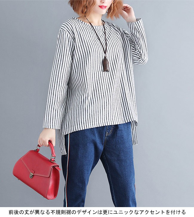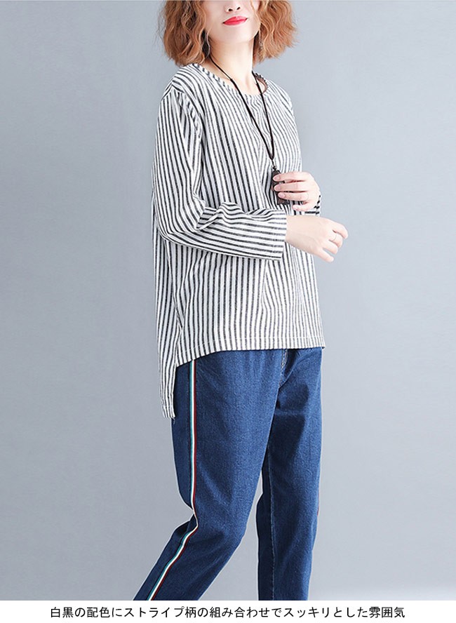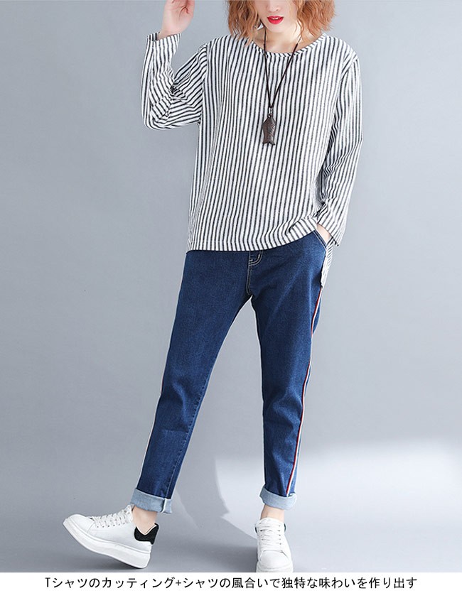 シャツ レディース 長袖 ゆったり 丸襟 ストライプ柄 不規則裾 女性用 長袖シャツ 長袖Tシャツ トップス 薄手 春秋物 夏物 カジュアルレディース用の長袖シャツが登場吸湿性・通気性に優れた綿混紡素材を使い、ソフトで爽やかな肌触りをもたらすTシャツのカッティング+シャツの風合いで独特な味わいを作り出す白黒の配色にストライプ柄の組み合わせでスッキリとした雰囲気前後の丈が異なる不規則裾のデザインは更にユニックなアクセントを付ける手持ちのアイテムとは簡単に組み合わせられ、人選ばずに着こなせる一枚カラー:写真色素材 綿混紡サイズ(cm) FF 着丈76 バスト120 肩幅44ご注意:※サイズは平置きサイズです。素人採寸ですので、若干の誤差がございます、ご了承ください。