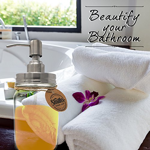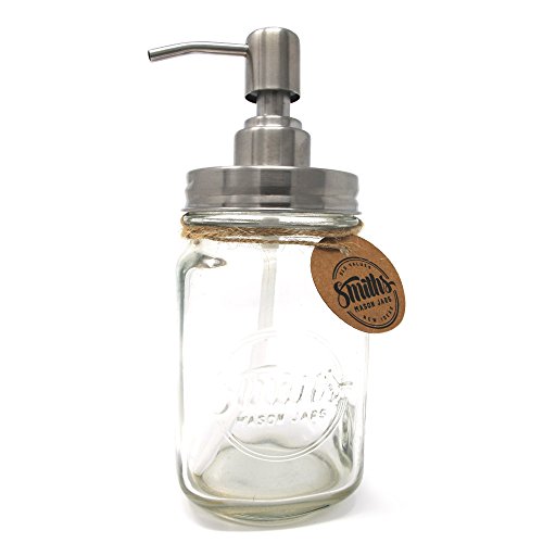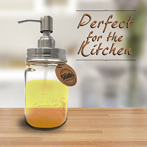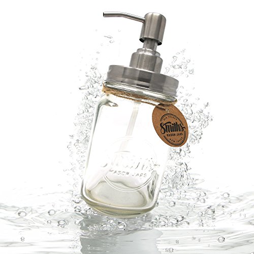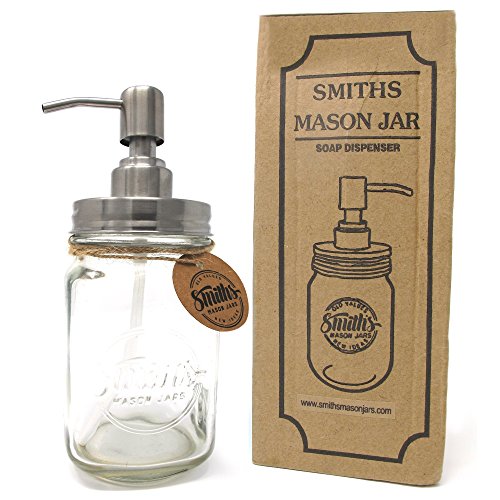 • DURABLE GLASS LIQUID DISPENSER; much like any other mason jar, the Smiths Mason Jar Soap / Liquid Dispenser has been made of durable glass, which can withstand potential accidents outstandingly, so you can use this liquid soap dispenser for the years to come.