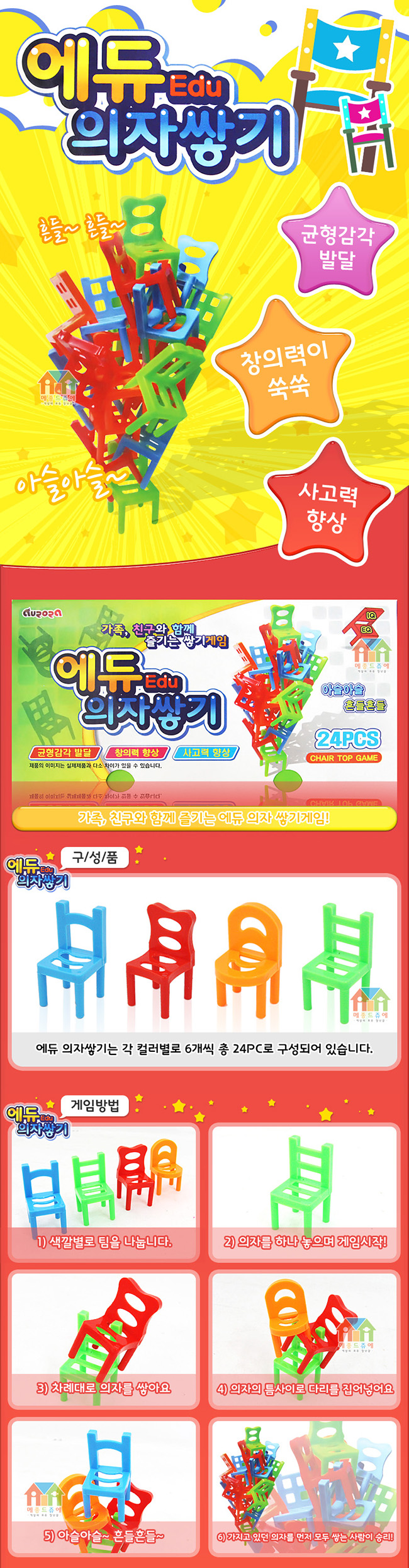 1. Divide the chair equally. 2. Stack up your chairs in order. 3. If the chair falls, the person who knocks down the chair is taken. 4. We will build up our chairs again. 5. The person who builds up all the chairs that he had first wins