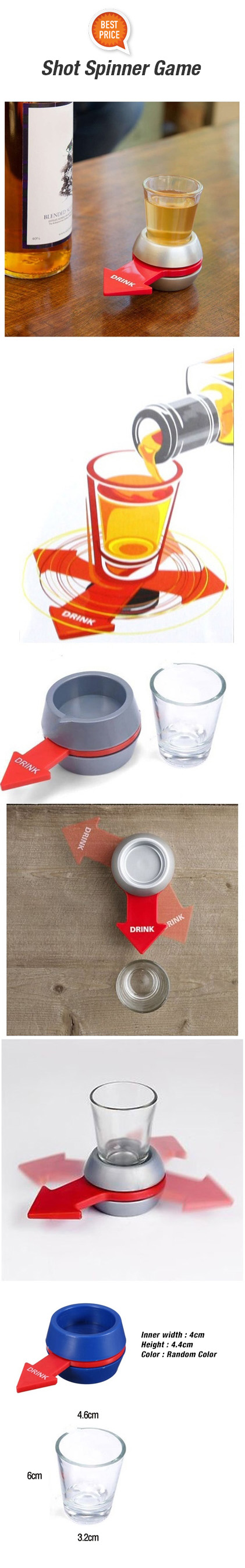 Fast moving party drinking game similar to spin the bottle. Load the glass with a shot of something nice, spin the arrow to discover who is nominated to down the drink in one! Maybe spin again to decide who pays! Great fun at parties or get-togethers. The only thing you need with this game is your favourite tipple and some great friends! The color of the shipment will be random.