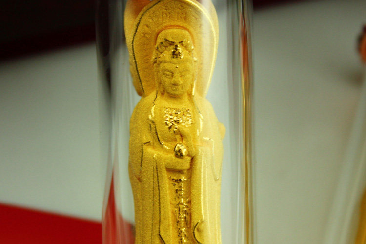 纯铜佛身,镀千足黄金敷砂金精制而成,一体成型,工艺精细,以南海三面观音为原版。