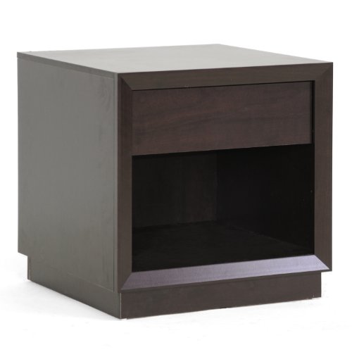 This minimalist, unobtrusively-designed modern living room table can double in purpose as a nightstand and excels at both. Our Girvin Designer End Table is built in Malaysia with an engineered wood frame, non-marking feet, brown faux wood grain paper veneer and a single drawer. This modern nightstand requires assembly and should be dusted clean with a dry cloth. Dimension:22.2"Wx22.125"Dx22.25"H, shelf dimension:21"Wx20.5"Dx10.25"H, drawer dimension: 15.875"Wx15.125"Dx3.75"H.Feature