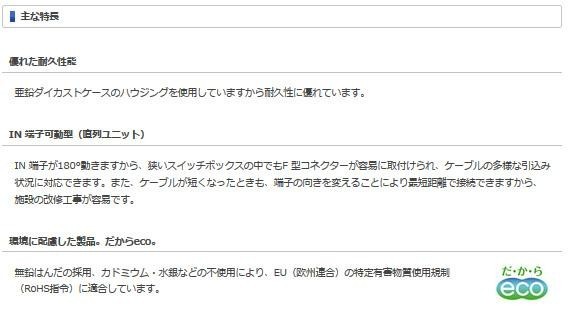 ハウジングには、亜鉛ダイカストケースを使用しており、耐久性に優れています。IN端子が180度動くので、狭いスイッチボックスの中でもF型コネクターが容易に取付けられ、ケーブルの多様な引込み状況に対応できます。また、ケーブルが短くなったときも、端子の向きを変えることにより最短距離で接続できるので、施設の改修工事が容易です。 |