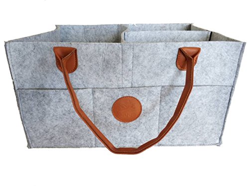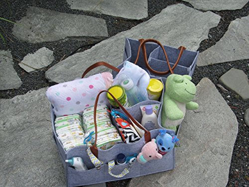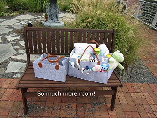 Nugget - Extra Large Baby Diaper Caddy - Large Improved Nursery Storage Bin and Car Organizer for Diapers Baby Wipes Grey Felt Cloth Brown Accent...
