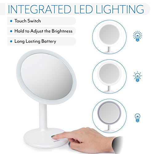 LED LIGHTING: LED lights are integrated into the frame of the mirror, giving you access to lighting whenever you need. Tap the touch switch to turn the lights on and off. Hold the touch switch to adjust the brightness of the lights and achieve the perfect lighting balance. Illuminate your skin and receive a clearer look at your features, so you can make the ideal adjustments when applying makeup. This mirror is perfect for using in low light conditions
