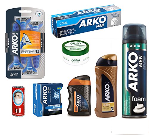 - 8 piece set which includes, arko men system 3 razor, arko shaving foam, arko shaving cream, arko after shave balm, arko after shave cologne, arko after shave lotion and arko hand/face/body cream