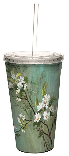 Tree-Free Greetings 35586 Nel Whatmore Blossoms on Gray and Teal Double-Walled Cool Cup with Reusable Straw, 16-Ounce