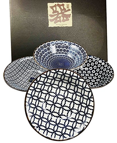 Made in Japan Blue Geometry Glazed Ceramic Rice Meal Soup Dining 5.5" Diameter Bowl Set Serves Four Great Gift Housewarming Asian Living Home Decor Kitchen Accessory Serving Dishware