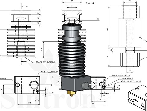 - (2) Metal construction with PTFE liner inside, good for ABS, PLA and other conventional print materials.