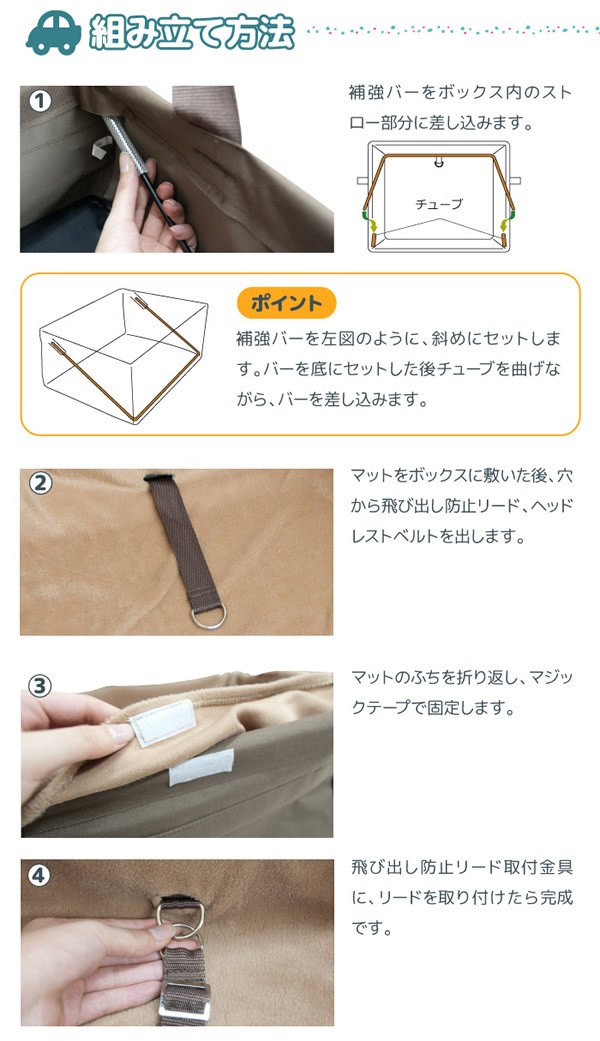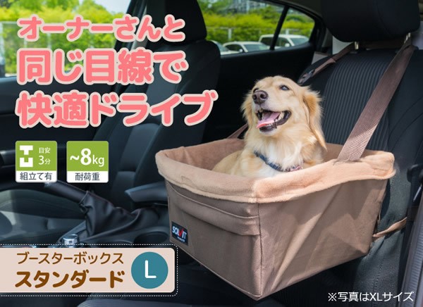 | ブースターボックスはボックス内にペットを繋ぎ、窓に足を掛けて立ったり座ったりする動作ができないつくりになっているため、足腰への負担の心配もなく、飛出し防止のフックがついている為、車内で動き回ることもありません。ヘッドレストのある車種に取り付ける事が可能で、ヘッドレスト固定ストラップは長さ調節が可能なのでワンちゃんが外を見通せる高さに合わせたり、お好みの高さでご使用いただけます。 |