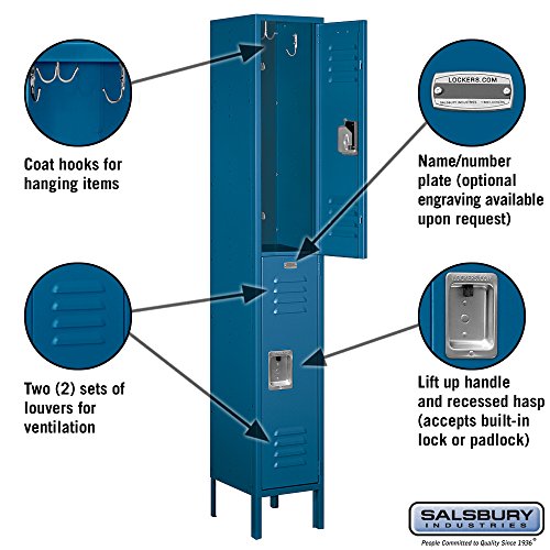 Salisbury 62000 Series Double Tier Standard Metal Lockers are Ideal for colleges, high schools, locker rooms, employee changing rooms, government agencies, gyms and many other applications. Constructed of 16 gauge steel. Available as unassembled or assembled (additional charge for assembled). Feature a durable powder coated finish available in gray, tan or blue. Available in heights of 5 feet and 6 feet (add 6" for legs). 5 foot high lockers have compartment sizes that are 12" wide, 30" high and 12", 15" or 18" deep. 6 foot high lockers have compartment sizes that are 12" wide, 36" high and 12", 15" or 18" deep. Available as 1 wide or 3 wide units. Salisbury Industries is an ISO 9001: 2008 certified company and has excelled in the field of manufacturing since 1936.Feature