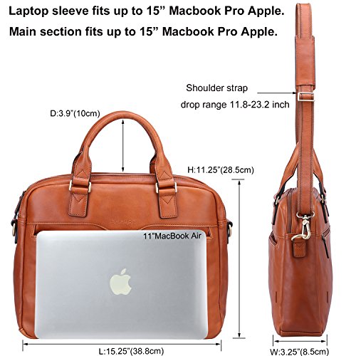 -. Feature : Italian calfskin leather with durable hardware / Tote handle with 4 inch drop. Additional detachable and adjustable padded shoulder strap. Its leather joined with canvas to make it more durable / 2 compartments with zipper closure / Exterior: Front 1 zipper compartment; Back 1 zippered pocket. Interior: 2 compartments, 1 padded laptop sleeve, 2 slip pocket, 1 cell phone pocket, 1 wallet pocket, 2 pen slots. / Dimension: 15.3 L x 3.3 W x 11.3 H inch