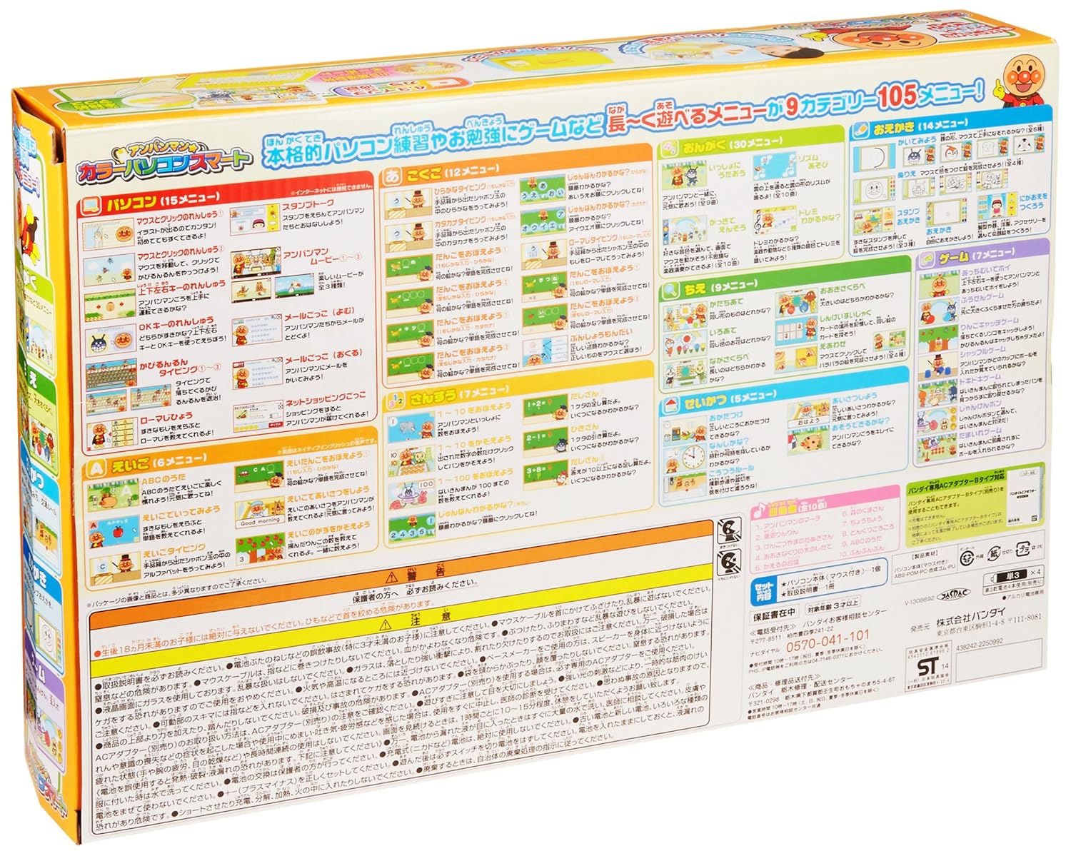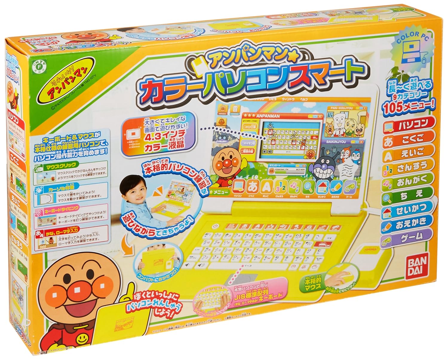 アンパンマンのカラーパソコンシリーズに新商品が登場!!今までよりさらにスタイリッシュなデザインに!また、カラー液晶サイズが4.3インチと大きくなり、より見やすく、遊びやすく、表現豊かなものに!マウスの使い方、タイピングの練習など、より本物のパソコン操作の練習が出来る新メニューが追加!長くたっぷり遊べる9カテゴリー、100メニューを収録。 使用電池:単3×4 (別売) 【商品仕様】4.3インチカラー液晶 (幅:約98mm×高さ:約57mm) 、JIS配列キーボード、本格的ボールマウス、バンダイACアダプターBタイプ対応