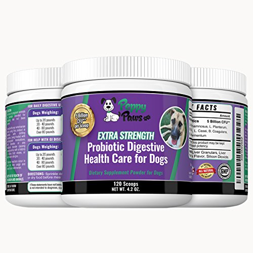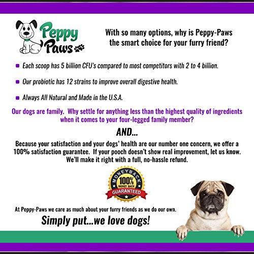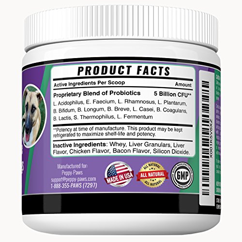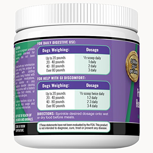 -. Feature : EASES TUMMY TROUBLES & MORE: With 12 high-quality strains, our fast acting dog probiotics helps restore intestinal balance and provide long-lasting relief of gas, bloating, diarrhea, itchy skin and anal gland issues. / FOR ANY AGE, BREED OR SIZE: From teacup to large dogs or puppies to seniors, this probiotic for dogs helps strengthen the immune system, restore good bacteria and promote better absorption of vitamins, minerals, and nutrients. / EXTRA-STRENGTH FOR MORE BENEFITS: Packed with 5 billion CFUs per scoop (most brands have only 2 or 4 billion) helps ensure your furry friend will get maximum benefits to promote excellent dog digestive health. / SAFE & ALL-NATURAL: You can feel good about a gluten-free dog probiotic supplement that's made in the USA in a GMP-certified, FDA-approved facility. Contains no artificial additives or fillers. / EASY TO GIVE YOUR DOG: Our flavored probiotic powder for dogs is so much easier to administer than a pill. Simply sP.R.Inkle over his wet or dry food each day. Even finicky dogs appreciate the taste.