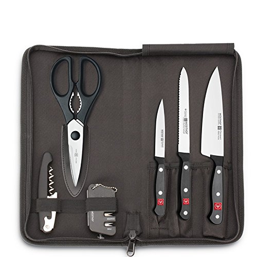 -. Feature : Hersteller : Wüsthof Dreizack, Solingen - Küchenmesser Serie : GOURMET / Art : Traveler Messerset mit Kochmesser, Aufschnittmesser, Gemüsemesser, Schärfer, Schere und Korkenzieher + Tasche