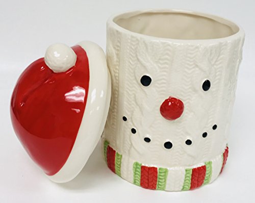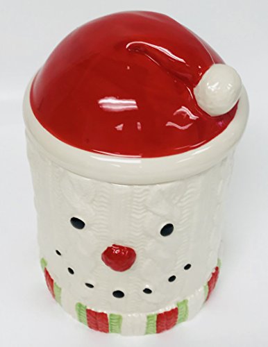 Ceramic Christmas Snowman Cookie | Storage Canister | Textured Cable Sweater Design & A Red Santa Hat Lid | 8 inches x 4.75 inches