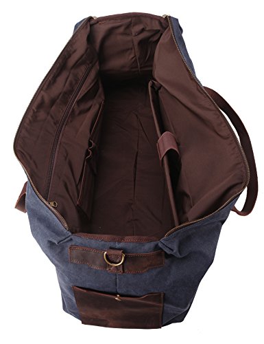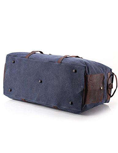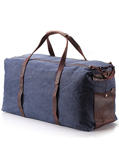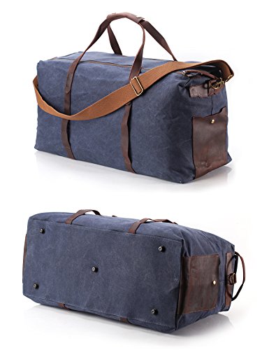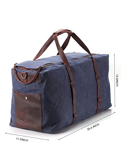 -. Feature : Oversized and large capacity. Outer dimensions: 25.6"x11.2"x12.6", maybe the largest on Amazon ever! Please note: It's really big bag, so look the dimension carefully / Material: high density Waxed Canvas with genuine leather trim, durable and water repellent. With PVC board inside top and bottom to shape the form / Water resistan / 2 inner pouch, 1 inner zip pocket, 1 compartment for 13" laptop or tablet, 1 removeable strap, 2 outside pocket / Zipper closure. Pefect for Travel, business trip, sport, etc