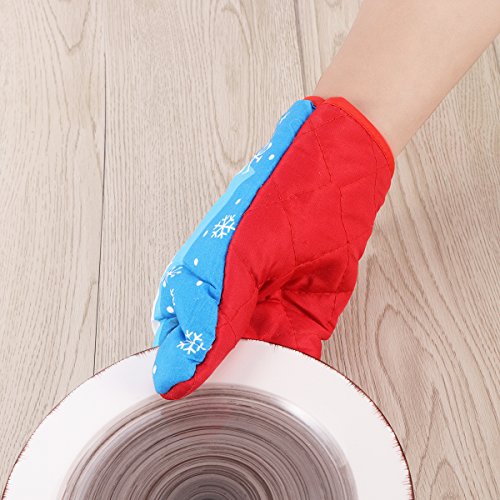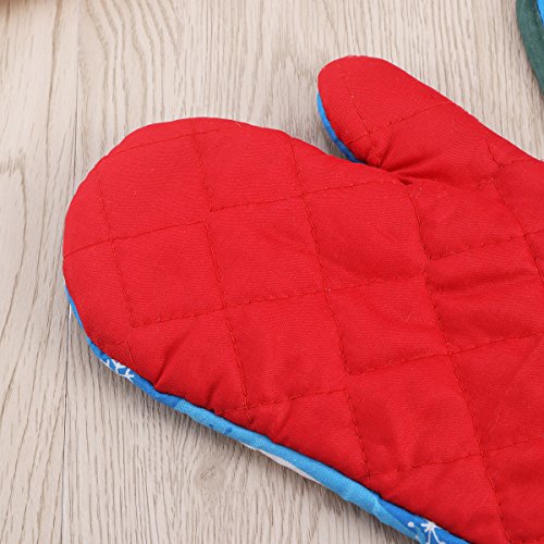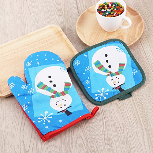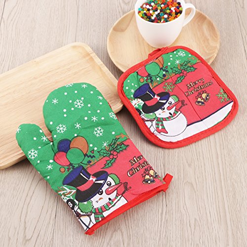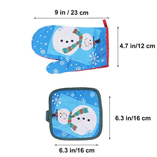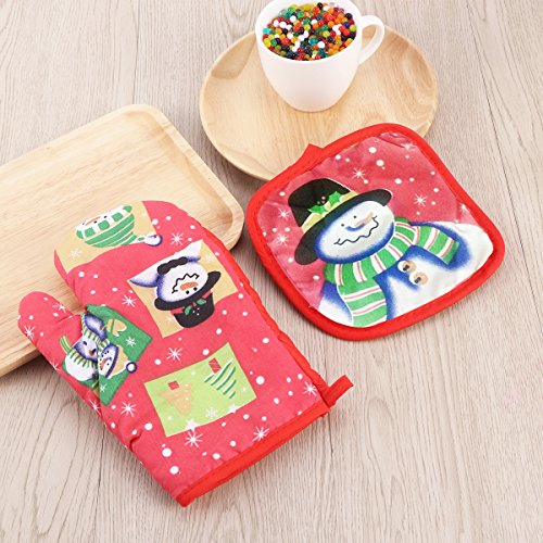 OUNONA 3pcs Christmas Oven Mitts,BBQ Microwave Baking Protective Glove And Hot Pot Heatproof Mat Set,Cotton, Machine Washable(Red Green Blue)