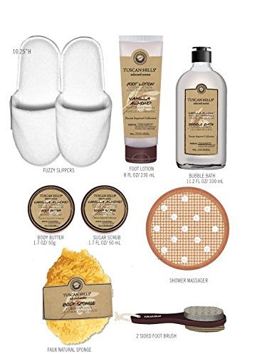 - Includes - 1 Pair Of Plush Fuzzy Slippers (About 10 inches) - 1 Vanilla Almond Foot Lotion - 1 Vanilla Almond Bubble Bath - 1 Vanilla Almond Body Butter - 1 Vanillla Almond Sugar Scrub - 1 Luxurious Shower Massager - 1 Body Sponge - 1 Two Sided Foot Brush