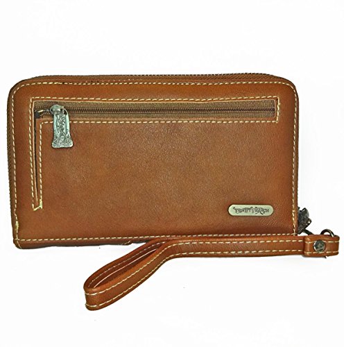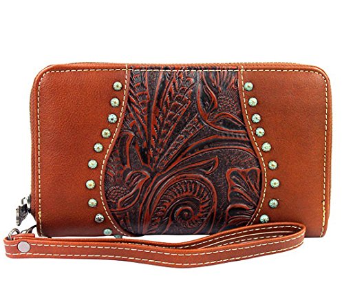 Studio : Western Fashion Publisher : Western Fashion Binding : Apparel Product Description New Trinity Ranch® Tooled Leather Wristlet Wallet w/ Patina Studs- BrownProduct Code: TR23-W002 Wallet Details: Length: 7.5 Height: 4 Depth: 1 Wristlet Strap 7 Floral and leaf tooled pattern on the genuine leather, Pu Leather Trim Backing (PU leather: leather particles coated in Polyurethane or a thin layer of leather coated in Polyurethane) - Embellished with Patina studs, green effect - Zipper pocket on Back, Trinity Ranch Name Plate - Removable, Wristlet Strap Inside: - 5 Bill Pockets, Zipper Pocket, 8 Card Slots 0