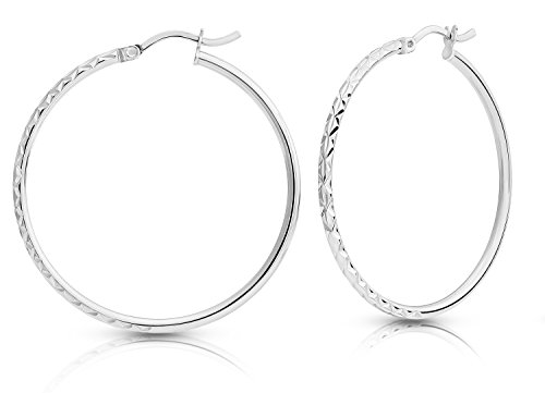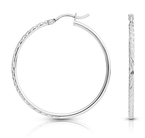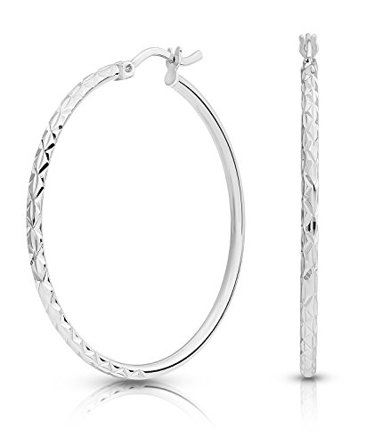 Add a modern touch of contemporary beauty to your style with these graceful hoop earrings. The fashionable round hoop earrings have been exquisitely made from 925 Sterling Silver and come with click-tip closures for a safe and secure fit. The lightweight hoops measure at 1.6 inches in diameter with a 2mm, tube thickness, making them comfortable to wear throughout the day. The chic hoops feature a lovely half and half style, with one half of the hoop detailed with a diamond-cut pattern, contrasting against the plain and simple other half. This delicate design is accentuated with a polished finish. This versatile look can be worn day or night, and is perfect for those who love elegant, classic jewelry!Feature