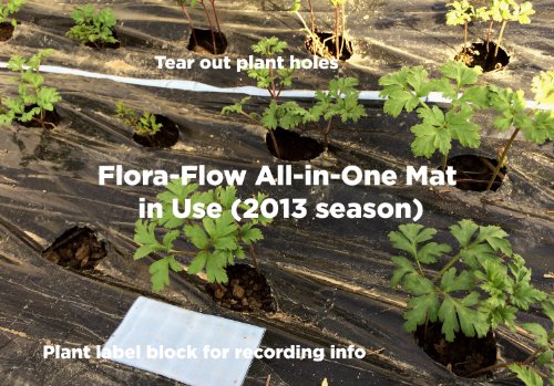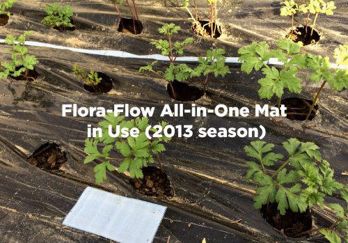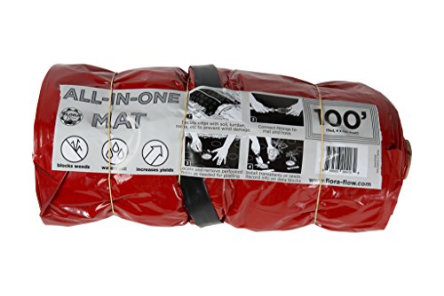 Professional growers combine drip irrigation and plastic mulch to give plants what they need: warm, protected topsoil, efficient watering and a virtually weed-free environment. They get a bigger harvest with less effort. Flora-Flow All-in-One Mats now bring this proven technology to home gardeners and growers of vegetables, berries, and cut flowers. All-in-One Mats are especially easy to use. The irrigation line is bonded to the mulch, enabling installation of both at the same time. The mulch features easy tear-out 2 inch diameter planting holes every 6 inches for rapid planting at 6, 12, 18 and/or 24 inches apart. Also, plant labels printed right on the mulch produce an orderly garden without measuring. As a result, the All-in-Ones offer weed and water control, large and early harvests, and orderly plantings in one package. Installation is simple: bury or weigh down the mat edges to resist wind, connect fittings to a hose, remove planting holes and plant. The mats can be cut to length for use with connector kits or standard irrigation fittings. All mats are 4 feet wide and are available with red, black and white-on-black mulch. We sell black mats with one or two drip lines, and we sell white-on-black mats with two drip lines. Black mats promote fast heating of soil in spring and high heat through the growing season. This is a good all around mat for most plants. Choose single line mats for larger plants, or double line mats for smaller, closely spaced plants. Red mats promote growth of tomatoes, but can be used with other plants as well. Researchers have shown a 10-20% yield increase in tomato fruit production using red mats. Red mats are sold with single drip lines only since tomatoes are widely spaced. White-on-black mats heat more slowly in the spring, but stay cooler longer than bare soil. Ideal for cool-loving greens and flowers that can not take the heat. Sold in dual-line configuration only.Feature