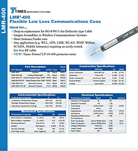 Studio : Kimberly Distribution LLC dba MPD Digital - US Publisher : Kimberly Distribution LLC dba MPD Digital - US Binding : Electronics Product Description Ultra low loss times Microwave LMR coaxial cable excels when used with Wi-Fi, antenna cables, Ham radio, patch cables, jumper cables, WLL, GPS, WLAN, LMR, WISP, WiMAX, SCADA, and mobile antennas. Double shielded times Microwave LMR braided cables for Ham and CB radio, RFID and wireless internet use are constructed from the highest quality copper, foam dielectric, and polyethylene materials for superb electrical and mechanical performance. Lmr cable solutions satisfy any application, indoors or outdoors, with robust outer jackets that shield them from abrasion and environmental damage for up to 20 years! times Microwave provides an ideal balance of performance, flexibility, and Economy. Times Microwave cables are built to perform and designed to flex braided cable technology has turned the corner with times Microwave cables and connectors being essential for any RF application that requires Ultra low signal loss. Our proven braiding technology helps ensure lower attenuation at every frequency. 0