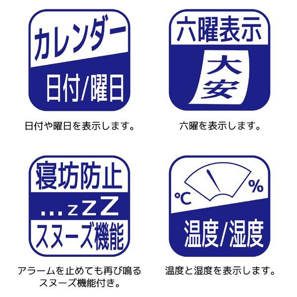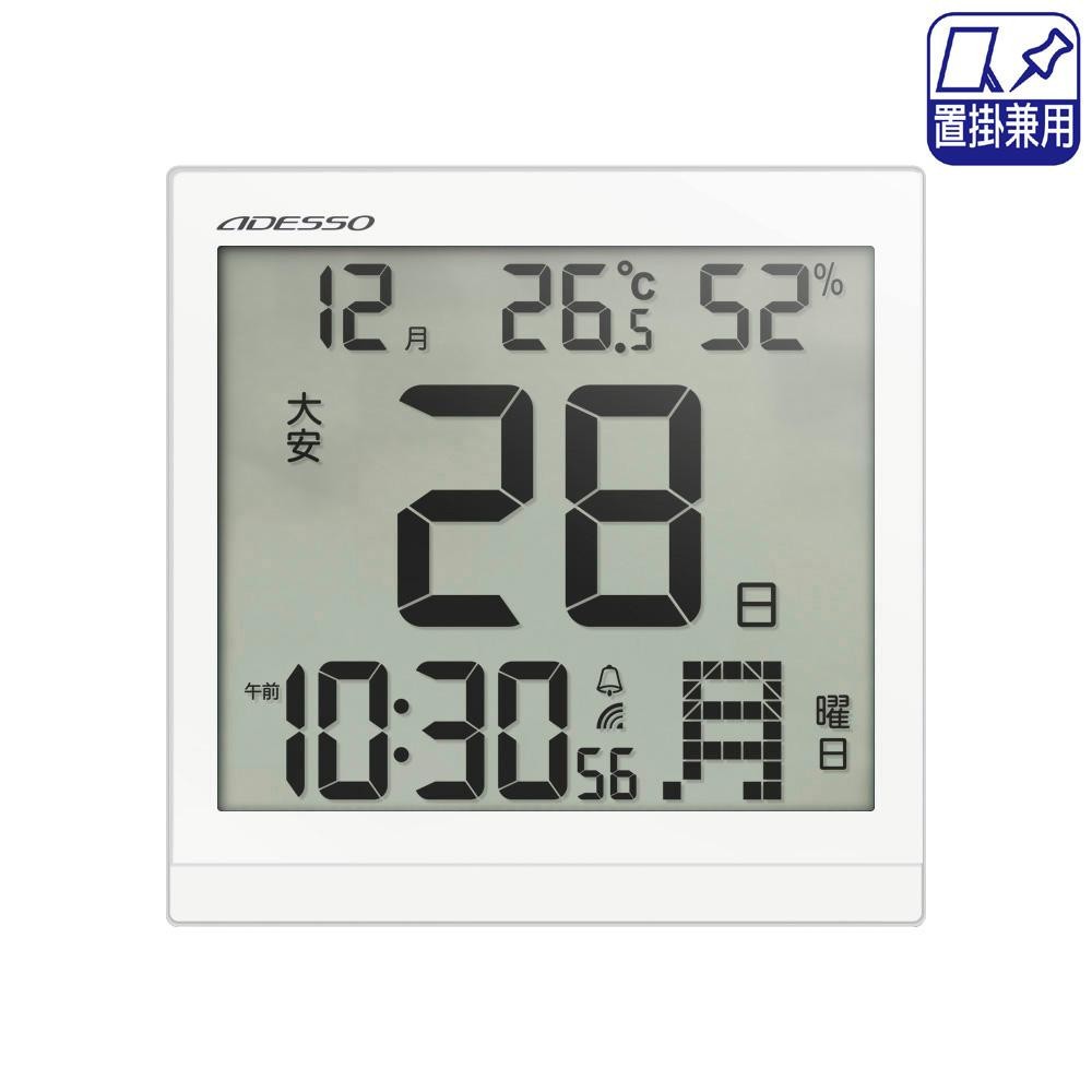 fk094igrjs置いても掛けても、どの角度から見てもクリアに見える大画面日めくり電波時計です サイズ 高223×幅223×奥行21mm 個装サイズ:24×25×4cm 重量 767g 個装重量:854g 素材・材質 ABS樹脂 仕様 置き掛け兼用 使用電源:単3乾電池×4 付属品 取扱説明書 保証書(保証期間:1年) 単3乾電池×4 製造国 中国 どの角度からでもクリアに見えます 置いても掛けても、どの角度から見てもクリアに見える大画面日めくり電波時計です