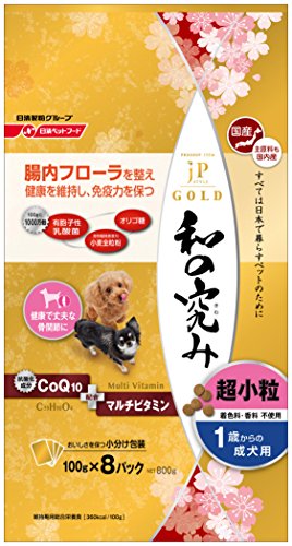 原材料:小麦全粒粉、チキンミール、中白糠、脱脂大豆、ビーフオイル、ビートパルプ、ホミニーフィード、チキンレバーパウダー、フィッシュオイル、ミルクカルシウム、米胚芽・大豆発酵抽出物、オリゴ糖、β-グルカン、米胚芽油、N-アセチルグルコサミン、脱脂米糠、魚肉抽出物、クロレラ、有胞子性乳酸菌、CoQ10、ミネラル類(カリウム、ナトリウム、塩素、銅、亜鉛、ヨウ素)、ビタミン類(A、D、E、B1、B2、B6、B12、パントテン酸、ナイアシン、コリン、イノシトール)、酸化防止剤(ローズマリー抽出物)