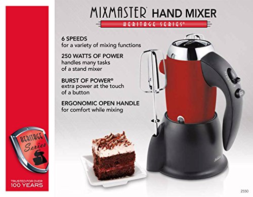 The Sunbeam Heritage Series Hand Mixer is built on the tradition of lasting quality and performance. It features a classic design with all the conveniences of modern technology. For a variety of mixing tasks, the mixer is designed with a powerful 250-watt motor and 6 speed-settings handle all mixing jobs. The Burst of Power button provides an extra blast of mixing-muscle to mix smoothly and evenly. With space-efficient, vertical storage caddy to display mixer, beaters and cord wrap and chrome beaters.Feature