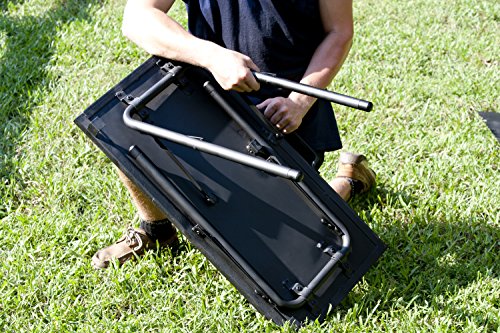 -. Feature : Convenient cooking table designed to accommodate 2 camp Dutch ovens / Durable steel construction with black high-temp finish; wide stationary handle / Safe to use with charcoal due to its 1/8-inch-thick steel coal deck / Folding legs with adjustable leveling feet; 3-sided attachable 12-inch-high windscreen / Measures 26 by 16 by 32 inches / Matching soft-shell cover available for this item