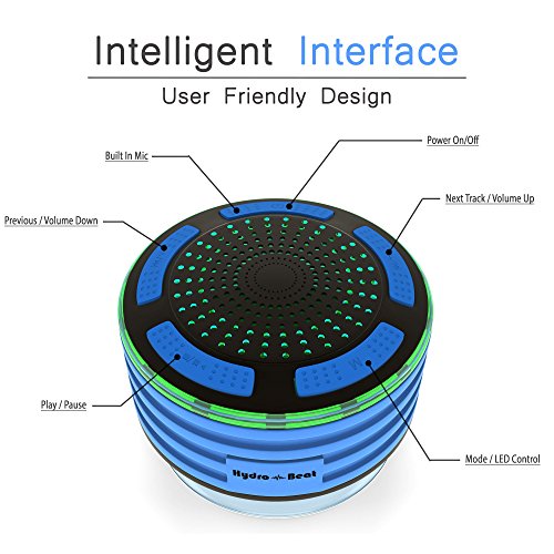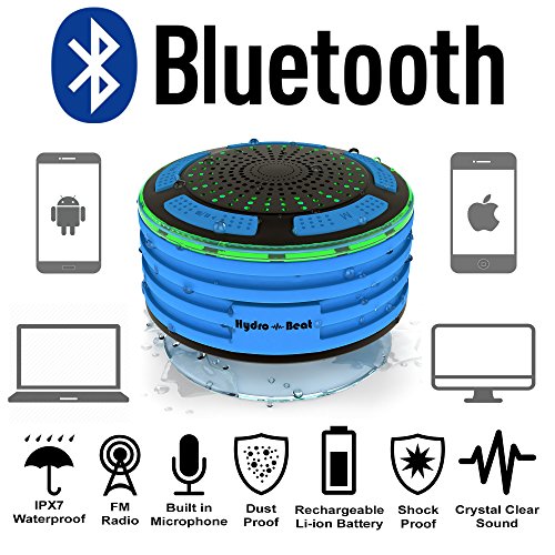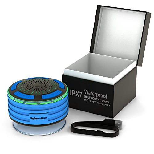 Shower Radios - Hydro-Beat Illumination. IPX7 portable fully Waterproof Bluetooth Speaker with built in FM Radio and LED mood lights. Rechargeable using micro USB. (Blue and Black)