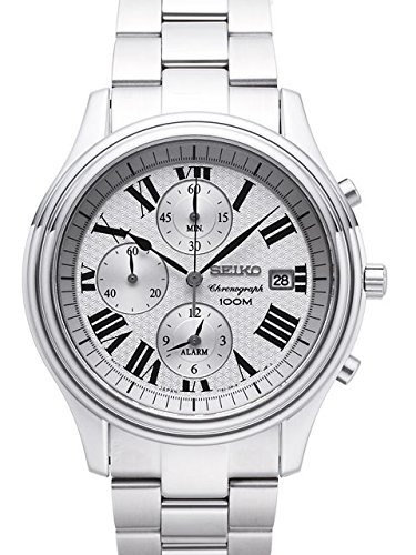 With trademark style and remarkable construction, the Seiko Men''s Alarm Chronograph Silver Dial Watch delivers a remarkable presence on the wrist. This stunning timepiece begins with a round 40.5mm stainless steel case with a fixed stainless steel bezel and a textured crown. These elements cradle a sleek silver dial, which is protected by a scratch-resistant hardlex crystal and features black Roman numeral hour markers and black hands powered by precise quartz movement. The dial also features th.