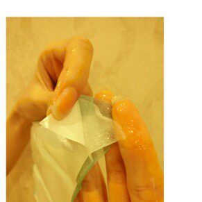 [Methods] neck film for two layer, soaked with liquid side Fuyu neck, after the position adjustment, tap out the air, so that the neck membrane close to the skin, wait 20-25 minutes
