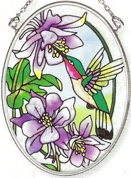 Amia Hand Painted Glass Suncatcher with Columbine and Hummingbird Design, 3-1/4-Inch by 4-1/4-Inch Oval