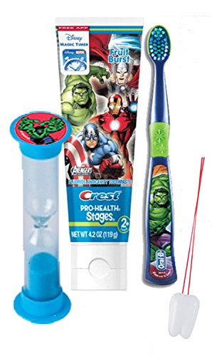 -. Binding : Health and Beauty -. Brand : Marvel -. EAN : 0761656260094 -. Feature : (1) Oral-B Pro-Health Stages Kids Manual Heros Toothbrush Featuring The Hulk! / (1) Crest Pro-Health Marvel Avengers Assemble Fruit Burst Toothpaste, 4.2 oz / (1) 2 Minute Dentist Recommened Hulk Brushing Timer To Encourage Proper Brushing! (Assorted Styles) / Plus Bonus "Remember to Brush" Visual Aid - Hang it in their bathroom or by their bed so they remember to keep their chompers sparkly fresh. You could also use these tooth charms to save one of your child's baby teeth! -. IsAdultProduct : 0 -. Label : Crest -. Manufacturer : Crest -. MPN : 41010145 -. PackageQuantity : 3 -. PartNumber : 41010145 -. ProductGroup : Health and Beauty -. ProductTypeName : HEALTH_PERSONAL_CARE -. Publisher : Crest -. Studio : Crest -. Title : Avengers "Incredible Hulk" Inspired 3pc Bright Smile Oral Hygiene Set! Soft Manual Toothbrush, Toothpaste & Brushing Timer! Plus Bonus "Remember To Brush" Visual Aid! -. UPC : 761656260094