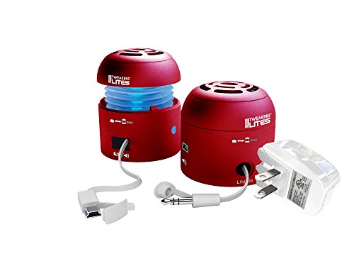 Tweakers Lites Portable Speakers provide monster sound in a small package. Simply twist open to expand the LED-lit acoustic chamber for enhanced audio and crystal clear sound. All connections are retractable, so there are no messy cords to untangle. The built-in long-life lithium battery lasts for hours and quickly recharges from any USB port with the supplied charge cable.