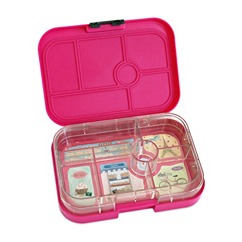 Yumbox is leakproof! Pack wet foods like yogurt and applesauce (not water). Seals with one lid. Kid-friendly latch. Removable tray with Paris themed illustrations holds five 1/2 cup portions (i.e., 2 1/2 cups plus dip in round well).