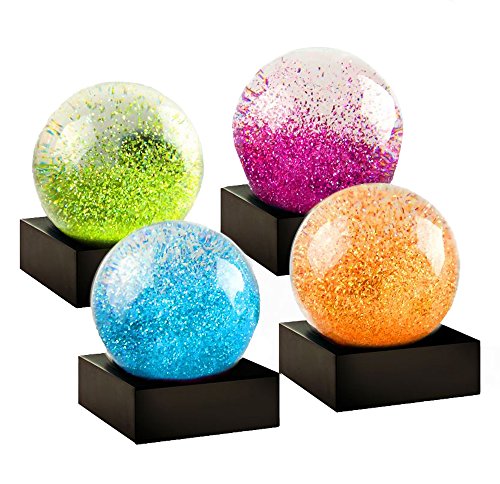 - A set of four miniature snow globes each featuring a vivid gemstone-like color interior.