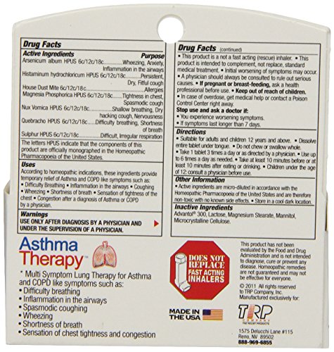 -. Feature : Asthma Therapy provides temporary relief for Asthma / COPD symp, such as: difficulty breathing, spasmodic coughing, shortness of breath, inflammation in the airways, wheezing, and sensation of chest tightness and congestion / Active ingredients are micro-diluted in accordance with the Homeopathic Pharmacopoeia of the U.S., and are therefore non toxic with no known side effects / This natural formula stimulates the body's own ability to alleviate the symp associated with Asthma / COPD
