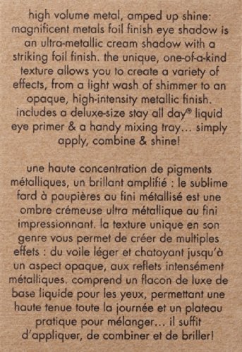 Create metal eyes that mesmerize with our magnificent metals foil finish eye shadow, a striking cream-to-powder shadow with a multidimensional metallic finish. Inspired by the runway, our one-of-a-kind formula is packed with rock-and-roll sparkle to achieve a variety of effects, from a light wash of shimmer to an opaque metallic finish. It also comes with a mini stay all day liquid eye primer and handy mixing tray simply prime, combine and shine.