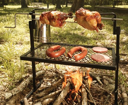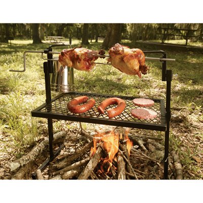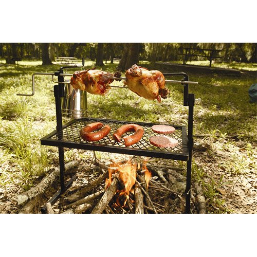 Amazon.com Take your campfire culinary skills to another level with this handy grilling accessory from Texsport. Easy to set-up, it features a height-adjustable 24-by-16-inch (W x D) grill surface and similarly height-adjustable stainless steel rotisserie spit that turns and locks in four positions for delicious, slow-roasted flavor. Twin steel side arms can swing into position to keep potted food warm. 0
