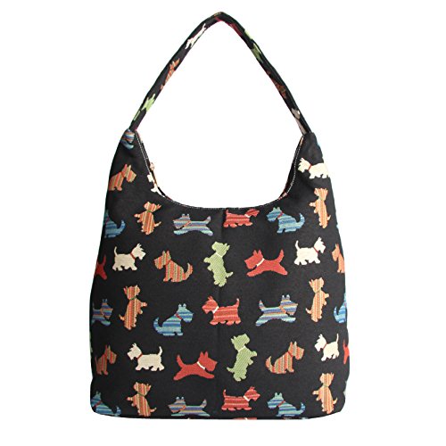 -. Brand : Signare -. Color : Black -. Department : womens -. EAN : 5060376422092 -. Feature : Contains plenty of room for travel essentials, make-up accessories and books or office utensils. / The inside contains a zip pocket and two slip pockets; with one particularly designed for your mobile phone. / Able to be used a shopping bag or travel bag. / Size: W 35cm x H 33cm x D 13cm Weight: 0.35kg / A colourful pattern of Scottish Terriers is printed across this tapestry design in a pop-art inspired fashion; it showcases the playful persona of the dog, as it prances across a noir background. -. Model : HOBO -. PackageQuantity : 1 -. ProductGroup : Shoes -. ProductTypeName : HANDBAG -. Size : Large -. Title : Signare Womens Tapestry Fashion Shoulder Bag/ Hobo Bag in Scottie Dog Design