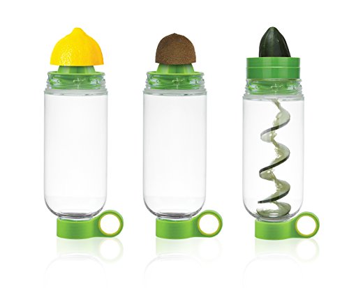 Includes One 28 oz bottle, One Citrus Press, One Kiwi Press & One Cucumber Slicer