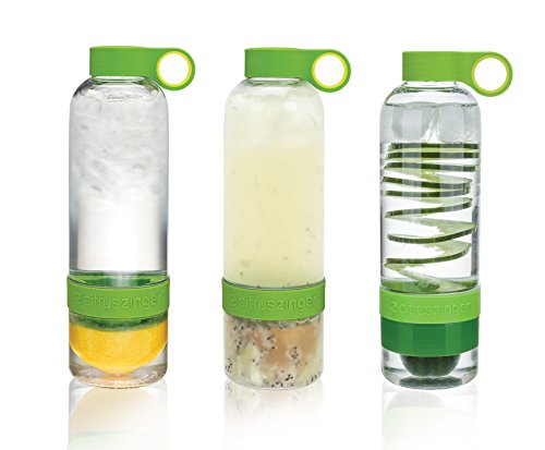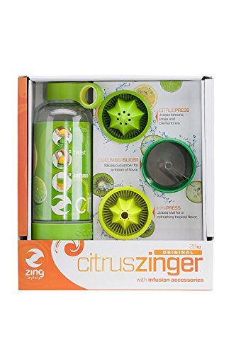 Customize your infused water with the citrus Zinger gift set from Zing Anything! this set includes one bottle, the classic citrus press, as well as the slicer and Kiwi reamer attachments, so you have versatility to make a flavor combination that zings! this gift set includes all 3 attachments: citrus press, cucumber slicer, and Berry slicer. To use your citrus Zinger simply unscrew the bottom cup of the Zinger, flip the vessel on the top cap, and lock in your favorite attachment. Press and twist your favorite ingredients. Replace the bottom cup, twisting tightly, and add water through the cap opening. Shake and enjoy!Feature