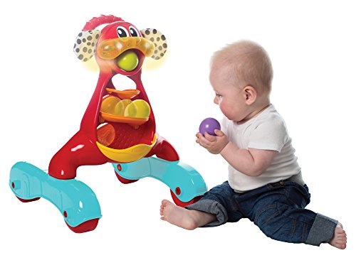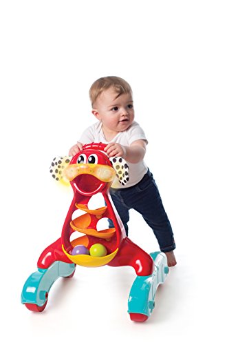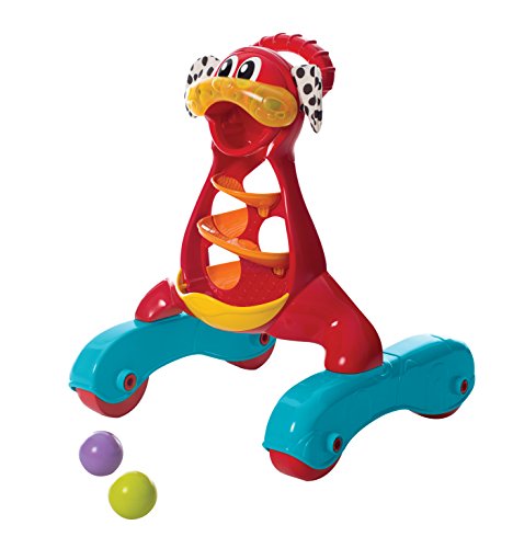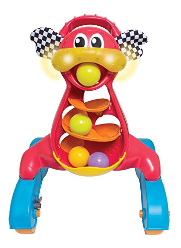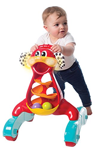 Come and Walk with me! This Activity Walker is perfect for any baby that is ready to get up and get walking! He comes with 3 colored balls and a twirly whirly ramp where you can drop the balls in and watch them race. The large easy-grip handle will help support your baby as they pull themselves up and push. This fun walker also has an added music & lights feature to encourage the auditory senses and visual learning of your groovy baby! Buy Playgro, your favorite toys to Play & Grow!