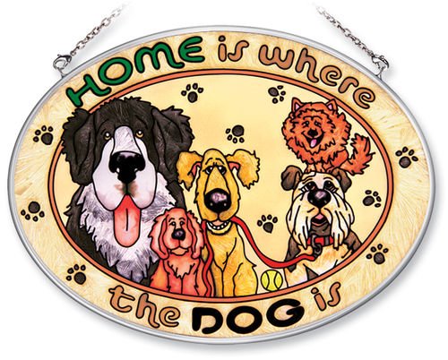 Amia Hand Painted Glass Suncatcher with Home Is Where The Dog Is Design, 5-1/4-Inch by 7-Inch Oval