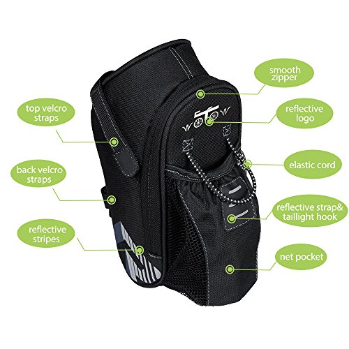 Well made, unique design --- the size of the bag is 2.7 x 3.5 x 9.5 inch (L x W x H), it is well designed to place items such as cell phone, multi-tool kit, keys, snacks, mini bike pump etc while cycling. The aerodynamic shape and position help to reduce air resistance to the minimum, which provide you high speed cycling experience.